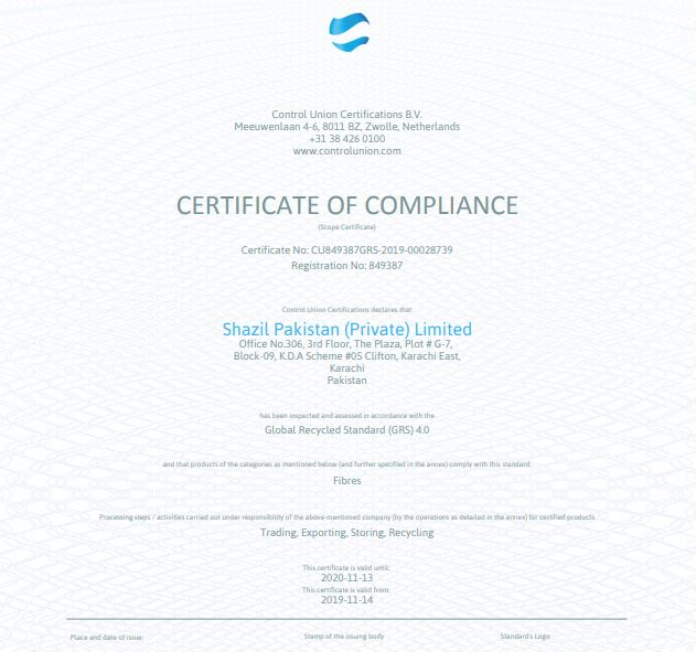 Shazil Pakistan (PVT) Limited is fully committed to provide high quality product to its customers that fully meet the requirements laid down under local & international regulations, compliance standards, and under the Global Recycled Standards. We offer the highest quality recycled PET Flakes & other products by investing in state of the art technology & systems. We are committed to partner with our customers & suppliers for a mutually beneficial & long term relationship. We achieve these goals by implementing, maintaining, and continually assessing operational systems and processes of our recycling lines. Our facility is regularly audited by internal & third party inspectors to ensure our facility & processes are up to date. Regular trainings of managers & workers are carried out to monitor our systems.